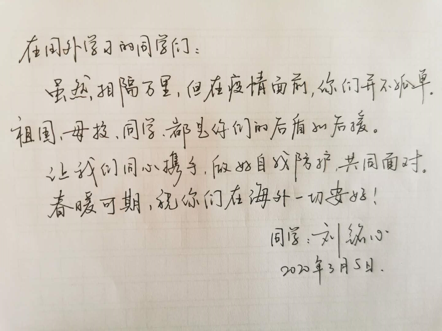 为鼓励海外学子,参加连线的同班同学,在连线前就早早的准备好了自己的小惊喜。在连线中,给同班同学送上了自己的携手抗疫手绘小漫画和祝福语。表达了对身在国外同学的关心。