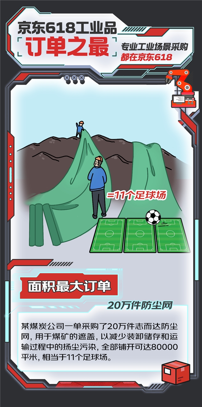 京东618期间,某煤炭公司通过京东工业一单采购了20万件志而达防尘网,用于煤矿的遮盖、遮挡,以减少装卸储存和运输过程中的扬尘污染。这批防尘网全部铺开可达80000平米,相当于11个足球场,是今年京东618“最大面积订单”。