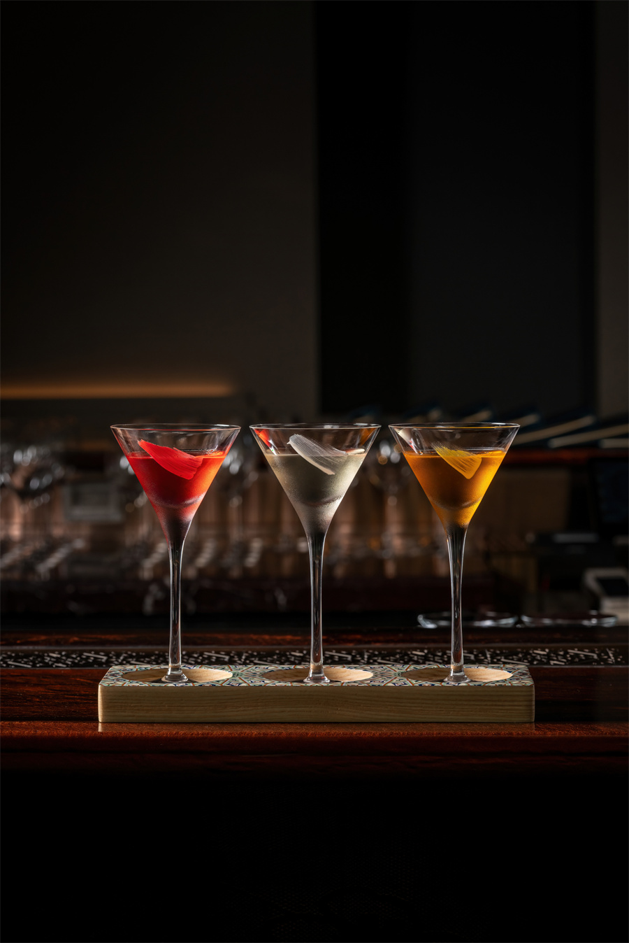 酒吧精选酒单巧妙再现六大社交俱乐部的非凡气质。仰光Pegu Club的精致格调,在 “Elephant Walk” 这款调酒中绽放芬芳,藜芦、芒果与椰子的大胆融合令人陶醉;“Regatta Colada” 则演绎了百慕大皇家海滩俱乐部的社交优雅,结合香槟与椰林飘香的热带风情。前往美国,纽约的Tuxedo Club以其经典绅士品味著称,“Blue Gardens Martini” 再现 Tuxedo Park 夜间漫步的浪漫气息;迈阿密霓虹闪耀的Babylon Club 则赋予 “Push It to the Limit” 以活力四溢的柑橘风味,令人心潮澎湃。随着时光流转,宾客还能沉浸于《卡萨布兰卡》中的 Rick’s Café Américain,品尝 “Gimlet Flight”——三款迷你吉姆莱特鸡尾酒,分别致敬法国、葡萄牙与摩洛哥的风味;而巴黎Les Deux Magots 以浓厚的咖啡馆风情呈现无酒精特调,如“In Bloom”,清新的黄瓜、树莓、蝶豆花与火龙果交融出馥郁芳香。